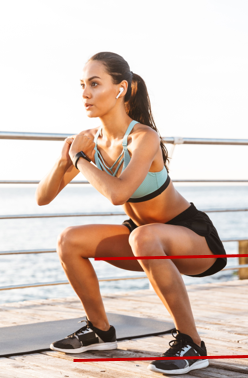 - 허벅지가 바닥과 평행이 될 때까지 내려간 뒤 천천히 올라옵니다.