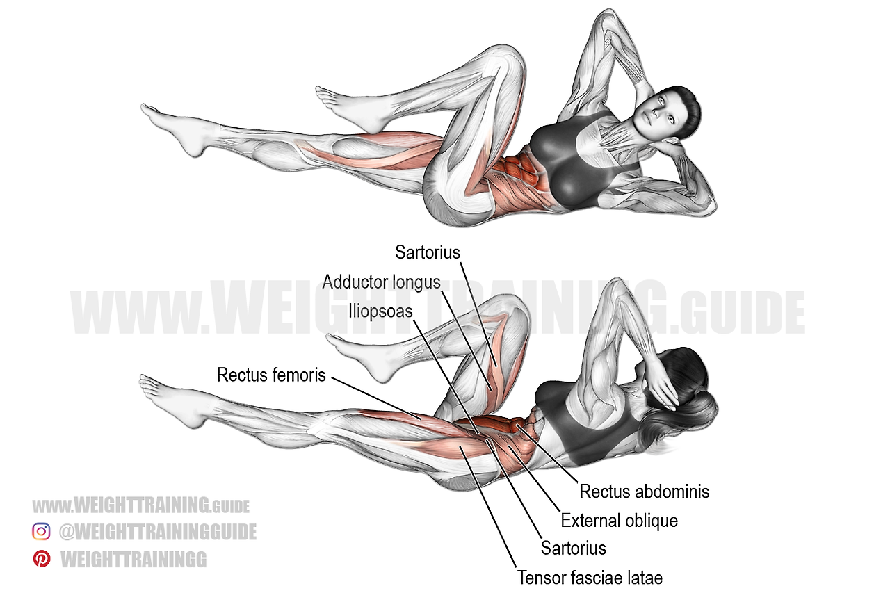 • 복부를 수축하며 상체를 들어 올리면서 오른쪽 팔꿈치를 왼쪽 무릎 쪽으로 가져갑니다.
